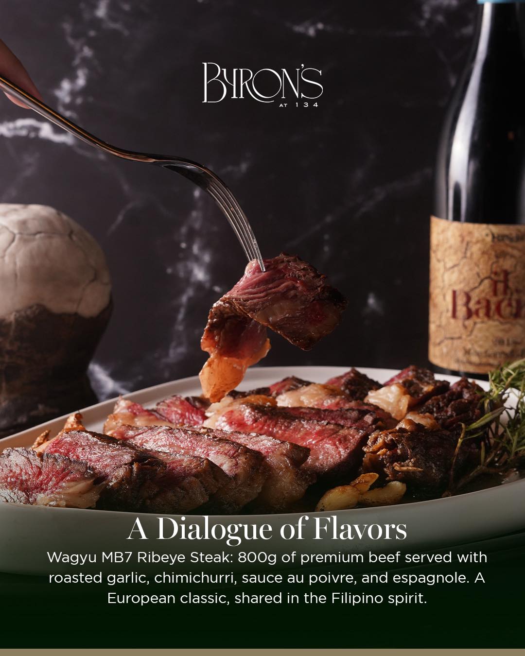 Among the restaurant’s highlights, the Wagyu MB7 Ribeye Steak, embodies this philosophy perfectly. An 800g premium beef served with roasted garlic, chimichurri, sauce au poivre, and espagnole, it’s a European classic shared in the Filipino spirit—a perfect example of the dialogue of flavors that defines Byron’s vision.IMAGE from Byron’s at 134’s Facebook page